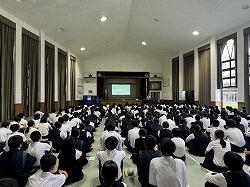 10月16日(水)7時間目に、「第2回理数科講演会」が開かれました。本校では中高一貫校のよさで、中学3年生は年間を通して理数科の行事にも多く参加しています。この理数科講演会もその一つです。理数科講演会では、第一線で活躍されている医療従事者や研究者をお招きしてお話を伺い、進路選択の一助としています。今回講師としてお話しくださったのは、宮崎大学農学部獣医学科の齊藤暁先生です。演題は「G2P-Japan コンソーシアムによる新型コロナウイルス研究」。「G2P-Japan コンソーシアム」とは、東京大学医学科研究所システムウイルス学分野の教授である佐藤佳先生が中心となって作られている研究共同体で、齊藤先生はそのメンバーの一人として新型コロナウイルスの研究をされてきたのです。先生は、猫が好きということが一つのきっかけになり、獣医師になられ、そしてその中でもウイルスの研究をする研究者としての道を邁進されています。獣医師は実はウイルスの研究をするにはとても適している、というお話を伺い、驚くと同時に納得もしました。全世界、新型コロナウイルスの大きな影響を受けたことは記憶に新しいこと。これからもパンデミックは起こる可能性があります。先生は、感染症の研究者がもっと増えていかなければ、と話されていました。進路選択を考えるうえでも、ひとつ幅が広がった、そんな講演会でした。ありがとうございました。
