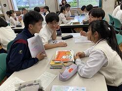10月17日(木)6時間目、3年生の国語の時間に「絵本の読み聞かせ」について学び、練習しました。来週、「福祉交流体験学習」で保育園・こども園を訪問し学習させていただく予定の3年生。ちょうど技術・家庭科では手作り絵本をそれぞれが制作していて、全員それを持参することになっています。講師を務めてくださったのは司書の相良先生です。授業では、実際に絵本を読み聞かせしていただきながら、読み聞かせの際にどんなことに注意すればよいか、丁寧に分かりやすく説明してくださいました。その後、それぞれのグループで、自分の手作り絵本や図書館にある絵本を使って実際に読み聞かせを練習しました。最後に、全体の前で増田陽さんと平山笑里さんが読み聞かせを披露してくれました。総合的な学習のキャリア探究・福祉として実施する福祉交流体験学習ですが、その学習と、読書・音読・朗読の分野から国語が、保育の分野から家庭科が教科を横断して連携して取り組むことができました。3年生、それぞれなかなか上手に読み聞かせができていました。保育園児に喜んでもらえると嬉しいですね。