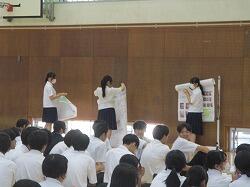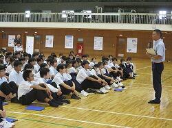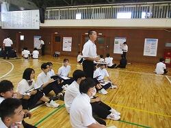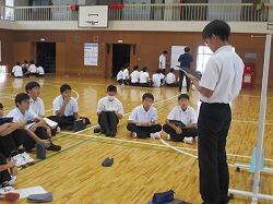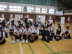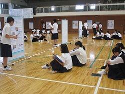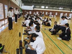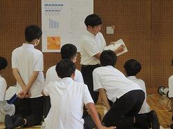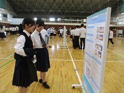 10月1日(水)3・4時間目に、附属中生は全校で総合的な学習の時間「自然科学探究(SKT)中間発表会」に臨みました。今回中間発表を行うのは、3年生です。3年生は夏休み明けに、自然科学探究の個人研究を8,000字の論文にまとめ、提出しています。今回は、その内容を1枚のポスターにして、1・2年生や高校1年7組(附属中13期生)の生徒・先輩方、先生方を前に発表し、意見交換や交流を行いました。会場である体育館に入ったら、まず全体の指示を聞き、3年生はポスターを準備しました。今年度はスーパーサイエンスハイスクール指定に伴い、総合的な学習の時間の改編が行われ、慌ただしい中でのポスター作成となりました。しかし、さすが3年生、昨年度2年生のときの経験を活かし、都泉祭明けの短い期間ですばらしいポスターをそれぞれがつくりあげ、昨年度よりぐっと成長した発表をしていました。また、1・2年生、そして高校1年生の先輩方は、熱心に発表を聞き、気づいたことや感想・意見などを伝えていました。特に、昨年度中学3年で論文作成を行った高校1年生は、ひとつ先輩として、よきアドバイスをしていました。最後に講評を、SSH推進部の久保先生(高校)にしていただきました.久保先生からは、発表がすばらしかったと大いに褒めていただき、今後に向けて、ポスターを使った発表形式では交流することが大切なので、さらに高めていくとよい、と話してくださいました。2月に最終的な論文発表会を控えている3年生にとって、よい機会となったのではないでしょうか。会が終わって、3年生は自分たちのポスターを片付け、2年生はパネルを片付け、高校の先輩方は体育館を授業ができるように戻して、みんなで協力して活動しました。本日来校されたJSTの主任専門委員の方から「中学校段階の探究としては素晴らしい。聞いている人に理解してもらおうとしっかりと相手を見ながら発表するなど発表スキルが身に付いている。今後も非常に期待しています。」とお褒めの言葉をいただきました。