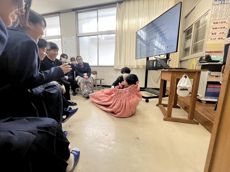 最後に「生まれる体験」と「妊婦体験」をしました。講話中は少し緊張気味だった生徒たちですが、体験になると積極的に動いていました。