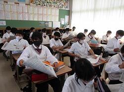 本校は、各学年1学級のため、都泉祭体育の部ではそれぞれの学級が、赤・青・白の三つの団に分かれることになります。そこで学級のまとまりの象徴となり、かつ、中学校の各団のまとまりの象徴ともなる工夫された学級旗を作り上げました。都泉祭準備の忙しい時期に各学級の「腕に覚えあり」のメンバーが一生懸命仕上げました。この旗、それぞれの学年が三つに分かれるように作られていて、学級では赤・白・青をつないで一枚の旗に、各団で応援するときは、各学年の例えば赤だけをつないで一枚の旗にできるように工夫されているのです。