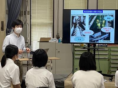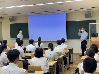 この後、東京大学に向かいました。東京大学では、鈴木英之教授より海の再生可能エネルギーというタイトルでの講義、そしてラボ見学をさせていただきました。現在、3年生は様々な活動の中でSDGsについて学習をしていますが、そのことにもつながる内容を分かりやすく説明していただきました。また、ラボ見学では講義の話につながる実験などを見せていただきました。全てのプログラムが終了した後に、大山祥さんがお礼の言葉を述べました。最後は赤門など東京大学の名所となる場所で記念撮影をしました。鈴木教授、宝谷先生を始めとした東京大学のスタッフの皆さんには大変お世話になりました。ありがとうございました。