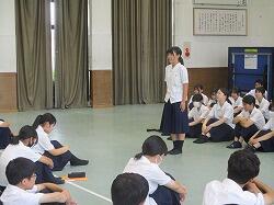 9月19日(木)7時間目に、地区中学校秋季体育大会に向けての壮行式が義友会館で行われました。2年生・1年生中心となった新チームでの初の中体連主催の大会となります。式では激励の言葉を清泉会会長の3年・平山笑里さんが述べました。次いで女子バドミントン部、女子バスケットボール部、男子バスケットボール部の順に、前に整列した選手が全員起立し、各キャプテン(安藤結貴さん・内田陽菜さん・大渡健慈さん)が決意の言葉を述べました(陸上競技に出場する齋藤誠志朗さんは教室で述べました)。そして、男子バスケットボールキャプテンの2年生・大渡健慈さんが堂々と決意を宣誓しました。教頭先生からは「ミスや失敗を恐れず挑戦してほしい」というお話がありました。さあ、いよいよ大会です。本校では23日(月)に開始される男女バスケットボール部が最初に大会に挑んでいくことになります。