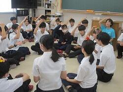 本校で行われている総合的な学習の時間・キャリア探究の中の福祉教育は、主に1年生と3年生で行われています。1年生では高齢者や障がい者について学び、3年生では乳幼児について学びます。3年生は10月23日(水)に「保育園・こども園訪問」が予定されていて、それに向けて3年生では10月2日(水)5・6時間目に「乳幼児との体験活動事前講座」が行われました。講師としておいでくださったのは都城市ボランティアセンター子育ち応援課の海老原直美様、竹松直子様、福吉沙弥香様、椎屋真知子様での4名の保育士の先生方です。おいでになったときに、学習用の道具運びに7名の3年生が協力してくれました。最初に乳幼児の発達段階ごとに遊んでいる様子やできることなどについて話していただき、生徒たちも頷いたり小さい頃を思い出して笑顔になって聴き入っていました。後半は、最初に童歌をみんなで歌ったり動いたりしながら体験しました。みんな楽しそうです。その後、持ってきていただいた乳幼児の遊具などを使って乳幼児の気持ちになって遊んでみました。14歳、15歳の中学3年生ですが、みんな無心に楽しそうに遊んでいました。お話を聴き、体験することで、23日に控えている訪問の心構えもできてきたようです。最後に生徒を代表して石橋彩花さんがお礼の言葉を述べました。お忙しい中、講師を務めてくださった4人の先生方、お世話くださいました都城市ボランティアセンターの皆様に心よりお礼申し上げます。ありがとうございました。
