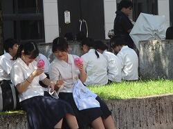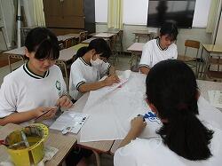 速度を遅くし、予想よりもずいぶん九州に近づいてきた台風のため、泉ヶ丘では日程の変更等が行われています。また、8月27日(火)は、朝は晴れていたけれど、途中から雨と日差しが混じる台風接近を感じさせる天気となりました。この日、附属中では朝から中学体育が行われ、主に中学生アトラクションであるダンスの練習を一生懸命行いました。振り付けを覚えつつ、フォーメーションの指示も出て、ダンスの全体像が把握できるようになりつつあります。ダンス実行委員を中心に3年生がよく頑張っています。午前中後半は、文化の部の準備です。3年生が合唱の練習をするというので音楽室にあがってみると「JAI HO!」(ジャイホー)という難曲に挑み、少しずつ成長の階段を上っていました。職員室前に来ると、2年生数名がパソコンを覗き込みながら合議したり笑ったりしています。どうやらCM作りの一端を垣間見たようです。総合教室前を通ると、今度は1年生が数名、白い布を前に集中して頑張っています。学級旗つくりにいそしんでいました。技術室や教室では合唱や展示物つくりをそれぞれ行っていました。再度音楽室に上がると、今度は2年生が合唱の練習をしていました。1年生のころからずいぶん成長して男女とも大人の声に近づいてきています。仕上がりが楽しみです。午後は、文化の部の準備と団活動が行われていました。雨模様だったため、雨天計画で、団ごとに時間や場所を変えて、高校3年生のリーダーたちを中心に、アトラクションや応援の準備・練習をしていました。台風接近により、準備に多くの時間が割けない状況も生まれてきています。それも見越して、みんな頑張っていました。