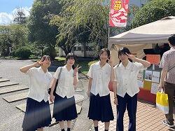 すばらしい天候に恵まれ、9月1日(日)、本年度の都泉祭(学校祭)が、本校を舞台とする「学校の部」から始まりました。8時30分から開会の部がオンラインでおこなわれ、中学生の発表・展示の紹介は、3年の石窪大和さんが、1年生の部から3年生の部までをまとめてコンパクトに紹介しました。初めて開会式がオンラインで行われ、動画等もあり、時間は押しましたが充実した内容でした。1年生は9時5分開始で自然科学探究の発表となっていたため、開始がやや遅れてしまいましたが、それぞれが1学期からテーマを決めて研究してきた内容を、上手にプレゼンテーションにまとめ発表していました。半年前まで小学生だったとは思えない立派な姿でした。会場も、さまざまなポスターや飾り付けで明るい雰囲気で、それぞれが書いたレポートも展示されていました。2年生は、6月末に行った職場体験学習を、それぞれ新聞と共にプレゼンテーションにもまとめていて、どのような体験学習であったのか、分かりやすく説明していました。2年生は、伺った職場の方にも今回の発表について案内しており、何軒か、職場の方もご覧になってくださいました。ありがとうございました。会場も、さまざまな道具を使って、楽しく見やすくレイアウトされていました。3年生は、5月に行った東京方面の修学旅行について、印象に残ったものをモチーフに模型を作ったり、みんなが楽しめるような遊び場を作ったりして、楽しく紹介していました。台風の影響で予定通りに進まず、ギリギリまで苦労してつくりあげた力作となりました。中庭では9時過ぎから書道部の書道パフォーマンスが行われ、大きな大きな紙に、書道部みんなで文字と絵を構成した作品を協力してつくりあげていました。中学生も、3年・石橋彩花さん、2年・井上結月さん、瓦田佳子さんが、りりしい袴姿で頑張っていました。10時から体育館で行われたビブリオバトルには、2年生・待木玲香さんが中学生として唯一参加し、発表しました。昨年度に続き、高校生に混じり頑張っていました。続けて体育館で行われたいずみArtist Stageでは、2年生・飯山結月さん、久野優さん、萬壽瑛那さんがバンドを組んで参加し、かっこいい演奏と爽やかな歌声を披露しました。義友会館には美術部の作品、書道部の作品が展示され、組紐体験などに中学生が積極的に参加していました。また、美術室では中学生の美術部員もレジンチャームや缶バッヂづくりを来場者に教えていました。屋台の食品を扱う場所でも、係活動で中学生も活躍していました。お昼近くになると、屋台の前は大行列。好天の下、外で三々五々食事をしたり、かき氷を頬張ったり、楽しそうに過ごす中学生たち。どの生徒にとっても、楽しい充実した1日となったのではないでしょうか。