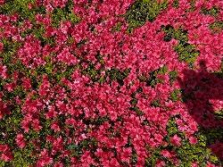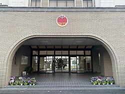 泉ヶ丘のスクールカラーは明るいえんじ色です。そして、泉ヶ丘附属中の校章も赤い色。校門を入って、校舎の方に歩いて行くと正面玄関の高い位置に高等学校の校章が、その下に附属中学校の校章が掲げられています。毎日登下校する生徒たちを見守っているようです。今、正面玄関の左右の植木は、赤い花がたくさん咲き、入学する生徒たちを心待ちにしているようです。