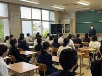 2年生は本校の進路指導部で、先日卒業した高校3年学年主任の先生から、「2020年度から変化した大学入試~その対応に向けて~」という演題でお話をしていただきました。さまざまな変化があった大学入試ですが、その変化に対応していくには、「授業を主体的に受ける」「高めあう仲間との学び合い」「日々の課題に誠実に向き合う」「分からないことをそのままにしない」「小テストは一発合格」といった、基本的なことが何より大切だと教えていただきました。また、卒業したばかりの附属中出身の先輩二人もわざわざ足を運んでくれ、生徒の立場から感じたことを率直に伝えてくれました。