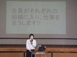 会場の義友会館に2・3年生は先に整列し、並んで入場してきた1年生を拍手で迎えました。三つの学年がそろって、いよいよ本年度の清泉会の始まりです。最初に「清泉会」とはどのような組織か、1年生に紹介しました。執行部のメンバーが、それぞれポイントを押さえて上手に説明していきました。各清泉会がどのようなことを目標として、何を具体的に取り組んでいるのか、よく分かったと思います。
