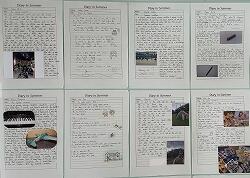 校内を見て回っていると、2・3年生の教室近くの廊下に英語の掲示物が貼っていました。「Diary in Summer」というタイトルがついてあり、夏休みの課題として、生徒が提出した作品です。(多くの生徒の作品を紹介しようと思ったら、作品の内容が分からない写真となってしまい、申し訳ありません。)