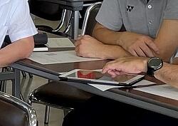 生徒たちは、はじめは緊張していたようですが、機器の操作にもすぐに慣れ、ミーティングが始まると、真剣に話を聞き、熱心にメモをとっていました。インタビュー項目は前もって考えていたのですが、講師のお話の中で解決できたものもあり、作戦タイムで練り直してインタビューに臨んでいました。