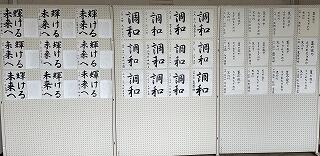左は書道の作品、右は美術の作品です。本校では、芸術系の授業は高校の先生が担当してくださっていますので、1学期のうちに貼り替えてくださったのだと思います。