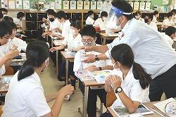 授業では,九州にある“火山”を白地図帳に書き込むことで,分布の特徴をつかんだり,“海溝”と火山の分布との関係,“火砕流”の危険性などを教えていただいたりして,生徒たちは新しい発見をしていました。