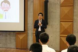 江夏邦威室長の講話の様子 講話を聞く2年生の様子