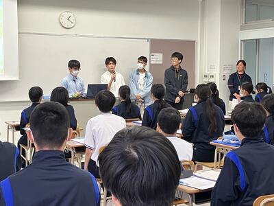 6月5日(水)5・6時間目に、2年生は総合的な学習の時間の自然科学探究の分野で、出前授業を受けました。今回のテーマは「DNAを観る!」。講師としておいでくださいましたのは、南九州大学環境園芸学部・菅野善明先生です。昨年度は大学に伺って授業を受けさせていただいたのですが、今年度は7時間目に防災訓練が計画されていましたので、多くの実験道具を持ってきていただいての授業となりました。言葉としては耳にすることがある[DNA」。では実際どのようなものなのでしょう。DNAについて基本的な知識を学んだ後、いよいよ「DNAを観る」ためにタマネギを使った実験に入りました。5人ひと組で、まず自分たちで実験に何が必要か考えて道具を受取に行くところから始まりました。全部の班が受け取った後、確かめてみると不足しているものがある班もありました。タマネギをすりおろし、洗剤や塩を加え、ろ過し、5人で協力して実験を進めていきました。いよいよDNAを抽出、というところで、「緊急地震速報です」と放送が入り、避難訓練に入ってしまいました。避難訓練を終えた後、2年生は理科室に戻り、見事「DNAを観る」ことができました。今回は助手として2人の学生の方も来てくださり、実験の補助をしていただきました。先生のお話、そして実験は、とても興味深く、生徒たちも活き活きと楽しそうに授業に臨んでいました。最後に、生徒を代表して久野優さんがお礼の言葉を述べました。今回は、避難訓練とちょうど被ってしまい、申し訳ないことでしたが、臨機応変に対応してくださり、感謝の言葉しかありません。菅野先生を始め、南九州大学の関わってくださった全ての方に心からお礼申し上げます。ありがとうございました。