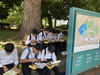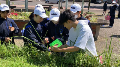 5月16日(木)午後、2年生は今年度初の校外学習「大学探訪」で南九州大学を訪れ、さまざまな学びを経験させて頂きました。毎年、南九州大学の手厚いご協力を得て、充実した大学探訪ができています。昼食後、タクシーに分乗して南九州大学に到着した2年生。今年度は、昨年度に引き続き、環境園芸学部の中野光議先生に講義をしていただきました。水生生物や陸上生物についてお話を聞き、それからふた班に分かれて、水辺ビオトープやヒーリングガーデンでそれぞれに生物の調査を行いました。採集用の網を使って、陸上では蝶や蛾、バッタ、芋虫などを、水中ではメダカやおたまじゃくし、ヤゴ、貝などを捕獲し観察しました。子ども達は非常に楽しそうで、どじょうなど珍しい生物が捕れると歓声があがり、互いに捕獲した生物を見せ合っていました。外遊びが少なくなった現代、こういう体験が初めての生徒もいたようですが、子ども達は貴重な体験ができたと嬉しそうに話していました。観察後は捕獲した生物を自然に返し、2年生を代表して井上結月さんが御礼の言葉を述べました。