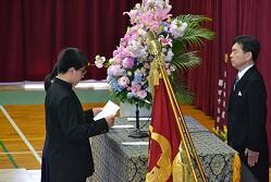 入学式では、新入生40名を代表して、河中應雅くんが高校代表生徒と一緒に、新入生代表宣誓を行ないました。また、入学式後の対面式では、附属中新入生の別府紗衣さんが高校代表生徒とともに、新入生代表のあいさつを行いました。