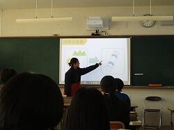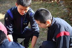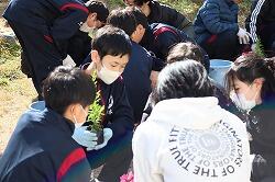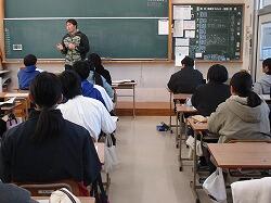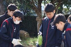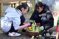 1月22日(木)4・5時間目に、1年生は総合的な学習の時間・キャリア探究の福祉体験学習の一環として、「花の移植体験」に臨みました。講師としておいでくださったのは、南九州大学の長江嗣朗先生です。また、南九州大学の学生の方7名も指導に当たってくださいました。1年生は昼休みにジャージに着替えを済ませ、4時間目は最初に講義を受けました。「人はなぜ花を贈るのだろう」という問いかけに、生徒たちは一生懸命思考を巡らせます。「花卉(かき)」という言葉も知りました。この体験学習は、1年生で行っている福祉体験活動の最後の活動にもなります。どのような気持ちで寄せ植えを作るのか、心や気持ちを大切にと学んで、5時間目の寄せ植えづくりの実体験に臨みました。教室を出て下足室前に全員整列して、指導してくださる学生の方々にも挨拶をし、4人ずつの10グループに分かれて寄せ植えづくりをしました。実は5時間目の講義の間に、学生の方々が寄せ植えのための準備をしてくださっていました。班ごとに二つの鉢に寄せ植えを作っていきます。土を入れて、花や緑を工夫しておいてみて、手順よく進めていきます。大学生の方々と話をしながら、とても楽しそうです。時間の終わりごろにはどの班も素敵な寄せ植えが完成しました。最後に、生徒を代表して冨吉花菜さんがお礼の言葉を述べました。長江先生、学生の方々、ご指導、本当にありがとうございました。