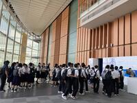 バスで移動し、午後はBSJ訪問です。外が雨模様だったこともあり、ご厚意でBSJのラウンジをお借りして昼食を採りました。いよいよBSJでの体験学習です。最初に全員でBSJについて、そしてこれから学んでいく内容についての説明を受けました。続いて三つのグループに分かれて、血管にカテーテルを通す方法の説明等と共に、実際に器具を使いながらの体験に臨みました。2人~3人組での体験は実に楽しそうで、目を輝かせて取り組んでいた姿が印象的でした。最後に生徒を代表してお礼の言葉を隅夏波さんが述べました。担当してくださいました石川様をはじめとしたBSJの方々に心からお礼申し上げます。ありがとうございました。