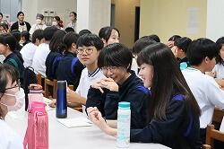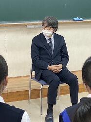 その日の放課後、高橋先生のご厚意で、希望者による高橋先生を囲んだ座談会も行われました。附属中からも、3年生石橋彩花さん竹本怜結心さん築地莉音さんの3人が参加させていただきました。全体で20名を越える参加者があり、生徒たちは高橋先生にさまざまな質問をしていました。医療系に進学したい生徒から、どのように子どもと接すればいいか、という質問が出たり、また、高校生活や大学生活はどのように過ごせばよいか、と進路・進学に関する質問が出たり、とみんな前向きで、居心地のいい空間がそこにありました。貴重な時間を割いてくださった、高橋先生に重ねて御礼申し上げます。