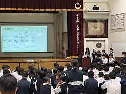 11月22日(木)7時間目に、義友会館清泉会集会が行われました。これは、11月19日(火)に行われた中央清泉会を受けて行われ、前旬間の振り返りと、次の旬間に向けての目標の確認と具体的対策を、各専門委員会から発表・確認しました。以前はプレゼンテーションで示して発表していましたが、現在は発表内容のプリントを生徒一人一人が手元に持ち、メモを取りながら聞く形になっています。これまでがどうだったか、そしてこれから何に取り組んでいくのか、しっかりと確認できます。また、今回は、10月末に取り組んだ福祉体験学習の報告もありました。1年生は9月から約一ヶ月半取り組んできた福祉体験学習3年生保育園・こども園訪問について発表しました。1年生は、高齢者福祉や障がい者福祉について、出前授業やオンライン授業を通して学んできたこと全般を分かりやすく発表しました。3年生はプレゼンテーションや保育園児の服装を用意して再現劇や・「ひげじいさん」の歌を交えながら、楽しく分かりやすく発表していました。どちらも充実した体験学習ができたことが伝わってきました。さらに、夏休みに行われた中学生拉致問題サミットに本県代表として参加した2年生後藤稟子さんが、そのとき学んだことをみんなに伝えたいと報告をしてくれました。未だ解決していない大きな問題について、詳しく知ることができました。清泉会全体も、さまざまな面でよりよくなるよう、執行部を中心にいろいろな改革がなされながら進んでいます。よりよい泉附であるよう、よりよい学校生活ができるようみんなで考え進んでいきましょう。また、最後に、集会の場を借りて、英語の暗唱・弁論大会の表彰披露も行われました。