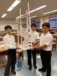 11月10日(日)宮崎県教育研修センターで行われた「令和6年MSEC度理数系生徒探究活動講座」に、科学の甲子園ジュニア全国大会に出場予定の、本校2年生重留悠吾さん田中史恩さん平峯楓士さんの3名、小松原中学校の3名の計6名が、多くの高校生と一緒に参加しました。さまざまな高校の探究活動の発表など行われ、大変勉強になりました。その中で行われたコンテスト形式の「マニュファクチャリング」(ものづくり)に参加した科学の甲子園ジュニア出場チーム。A3ケント紙3枚を使い、5秒間倒れないものを決められた時間内に作り高さを競うのです。ケント紙を使って高く高くタワーを作ったジュニアチーム、制限時間内に、椅子に乗らないと計りきれないくらい高いタワーを作りました。カウント5秒間キープでき、全高校生チームを相手に見事1位を勝ち取りました!頼もしい理数科ジュニアが育っています。