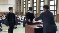 その後、義勇会館にて修了式を行いました。修了証書授与式では、1年生40名、2年生40名全員が無事に各学年の課程を修了することができました。その後、生徒を代表して、坂元希成さん、増田陽さんが3学期の反省を述べました。「学校での休み時間の使い方がよくなかった」「この生活への慣れから少しずつ誘惑に負けて勉強をおろそかにした」などの課題を解決するために、4月からは気持ちを新たに頑張りたいと述べていました。教頭先生の話では、WBCの栗山監督の著書のタイトルにもなっている、幕末の武士 橋本左内の「稚心を去る」という言葉を紹介し、子供っぽい心を捨て去り、4月に入学する後輩たちの手本として、本校の校訓である質実剛健を目指してほしいと話されました。