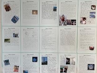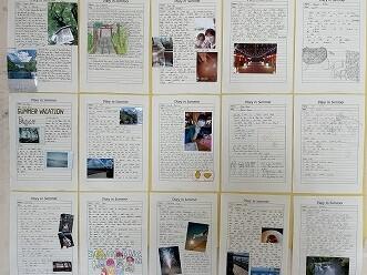 9月9日。校内を歩いていると、2・3年生の「夏休みの思い出」の英作文が貼られていました。