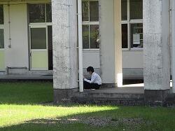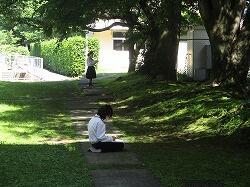 先週の長雨がやっとあがり、爽やかな初夏の日差しが降り注ぐ5月のある日の午後。校内を歩いていると、あちらこちらにスケッチブックをもった1Aの「画家」が、一生懸命スケッチにいそしんでいました。ちょうど美術の時間で、高校の美術の先生の指導を受けながら、自然の風や光を体いっぱい浴びて、豊かな時間が流れていました。