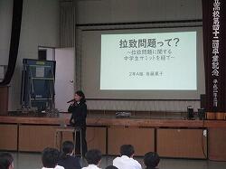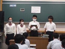 11月22日(木)7時間目に、義友会館清泉会集会が行われました。これは、11月19日(火)に行われた中央清泉会を受けて行われ、前旬間の振り返りと、次の旬間に向けての目標の確認と具体的対策を、各専門委員会から発表・確認しました。以前はプレゼンテーションで示して発表していましたが、現在は発表内容のプリントを生徒一人一人が手元に持ち、メモを取りながら聞く形になっています。これまでがどうだったか、そしてこれから何に取り組んでいくのか、しっかりと確認できます。また、今回は、10月末に取り組んだ福祉体験学習の報告もありました。1年生は9月から約一ヶ月半取り組んできた福祉体験学習3年生保育園・こども園訪問について発表しました。1年生は、高齢者福祉や障がい者福祉について、出前授業やオンライン授業を通して学んできたこと全般を分かりやすく発表しました。3年生はプレゼンテーションや保育園児の服装を用意して再現劇や・「ひげじいさん」の歌を交えながら、楽しく分かりやすく発表していました。どちらも充実した体験学習ができたことが伝わってきました。さらに、夏休みに行われた中学生拉致問題サミットに本県代表として参加した2年生後藤稟子さんが、そのとき学んだことをみんなに伝えたいと報告をしてくれました。未だ解決していない大きな問題について、詳しく知ることができました。清泉会全体も、さまざまな面でよりよくなるよう、執行部を中心にいろいろな改革がなされながら進んでいます。よりよい泉附であるよう、よりよい学校生活ができるようみんなで考え進んでいきましょう。また、最後に、集会の場を借りて、英語の暗唱・弁論大会の表彰披露も行われました。