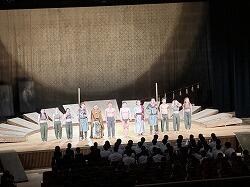 11月2日(金)午後に、MJホールにて芸術鑑賞教室が開かれました。今年は演劇。上演されたのは、東京演劇アンサンブル「走れメロス」です。「走れメロス」は、現在も中学校2年生の国語の教科書にその作品が掲載されている太宰治の小説です。中3の生徒は既に学習済みです。ホール全体を舞台として、通路を多くの出演者が走ります。大変躍動的で舞台のすばらしさをしっかりと味わえる作品でした。役者の方がすぐ近くを通り、生徒たちも視線をあちらこちらに配り、躍動的な鑑賞となりました。連続80分、みんなで時折声を上げたり、走るメロスに「頑張れ」と声をかけたり、とても楽しんでいる様子でした。1・2年生は2階席からの鑑賞となりましたが、身を乗り出すように鑑賞していました。東京演劇アンサンブルの方々、すばらしい舞台をありがとうございました。