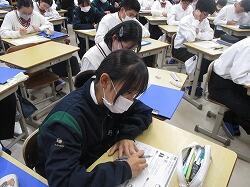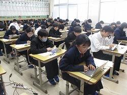 先日、2学期の期末テストが終わったばかりですが、1年生12月に入ってすぐ「みやざき学習状況調査」に挑みました。これまで学習してきた内容の定着や自分の学習状況等の調査で、県内の中学1年生が同時期に調査を受けています。以前は紙の問題用紙・解答用紙だったこの調査、今はタブレットを用いての入力の形をとっています。タブレットの使用はさまざまな面で拡大の一途をたどっていますが、テスト形式のものに用いられるのは現状ではまだ少なく、機材のトラブルや通信状況の不安定などないかやや緊張しながらの調査となりました。県全体の傾向を見ることができる調査ですが、個別の状況の把握にも多いに役立ちます。結果を待ちましょう。