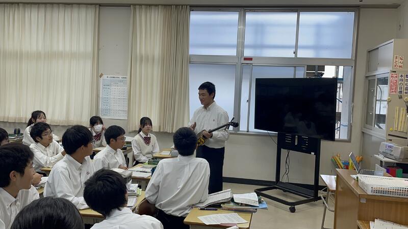 令和6年11月14日(木)の7時間目、英語の時間に「Sanshin」での合唱タイムがありました。英語の教材に「Takashi's Speech about Sanshin」というレッスン内容があります。前回の英語の授業の時に「Sanshin」の内容にふれたところ、重留悠吾さんが、「三線」を持っているということ、そして弾けるということを教えてくれたので、実際に持ってきてもらいました。小学生の頃、与論島にいた時に地域の人たちと練習したり、小学校の発表会で弾いたりしていて身近だったようで、「三線」にまつわる様々な歴史的背景や歌の歌詞などもわかりやすく説明してくれました。そして2Aのみんなと一緒に合唱しました。