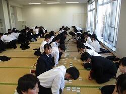 期末テストも終わり、12月23日(月)に予定されている「百人一首大会」に向けて、各学級頑張る季節がやってきました。文化清泉会を中心に、それぞれの学級、朝の会や帰りの会、昼食時間などに百人一首関連の取組を始めています。百人一首の問題を出したり、暗唱したり、得意札を増やしたり、試合に向けての暗記プリントを用意したり。学級によっては学活の時間等に既に練習を始めているところも……。そんな中、時間割を工夫してもらい、12月2日(月)6・7時間目には1・2年生3日(火)3・4時間目には2・3年生2時間連続の国語が同時に組まれており、その時間を利用して学年対抗の練習を行いました。2・3年生は既に経験済みの百人一首大会ですが、1年生にとって初めての大会となります。1年生は札の並べかたを学習しただけで、札を取る対抗戦をほとんどしたことがない状態です。会場としてお借りしたいずみ会館に行ってみると、ふた学年ともきれいにスリッパを靴箱にきれいに並べていました。早速練習。先輩に学びながら、一生懸命頑張っていました。翌日。2・3年生はさすがに慣れていて、それぞれのペースでどんどん札を取っていました。2・3年生は、昨年度は高校生(高1・高2)も参加した中で、共に入賞を果たしています。今年が楽しみです。これから国語の時間で何時間か練習を行いますが、各学級での取組がとても大切になってきます。また、文化清泉会の活動として、3日(火)を皮切りに計5日間の放課後希望者自主練習(18時まで)が計画されています。中学生、頑張りましょう!