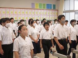 7月になりました。梅雨の最中、雨を心配しながらの日々です。そんな中、7月5日(水)7時間目、久しぶりに校内を散歩しました。中学生は3学年とも、総合的な学習の時間や学級の時間としてさまざまな活動を行っていました。2年生は来週に控えている職場体験学習の事前学習を行っていました。ちょうど前を通りかかると、「おはようございます。」「こんにちは。」「ありがとうございます。」といった挨拶の声が聞こえます。学校でも職場でも挨拶はとても大切です。その練習をみんなでしているところでした。3年生の教室にあがってみると、2学期最初に控えている、「都泉祭」に向けて、各担当ごとに準備を進めていました。それぞれ熱心に話し合ったり、作業に取り組んだりしています。中学校最高学年としての自負と責任感を感じました。階段を下に降りていくと楽しそうな声が。1年生の教室です。今週から1Aの仲間として一緒に学習している髙橋バレト美珊さんも一緒に、41名全員でコミュニケーションゲームをしていました。みんな笑顔です。仲が深まったところで最後に41名全員でクラス写真を撮って締め括り。とても楽しそうでした。階段を1階に降りていく途中には保健室の掲示板。いつも工夫されたためになる保健面の情報が掲示されています。今は「暑さ指数」についての掲示がされていました。ちょうどこの日貼られていた暑さ指標のマークは「笑顔」。生徒たちの笑顔と、下足室横の花壇に1輪だけ咲いていた花の笑顔と重なって見えました。