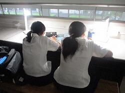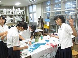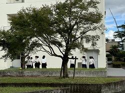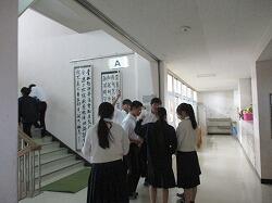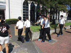 速度を遅くし、予想よりもずいぶん九州に近づいてきた台風のため、泉ヶ丘では日程の変更等が行われています。また、8月27日(火)は、朝は晴れていたけれど、途中から雨と日差しが混じる台風接近を感じさせる天気となりました。この日、附属中では朝から中学体育が行われ、主に中学生アトラクションであるダンスの練習を一生懸命行いました。振り付けを覚えつつ、フォーメーションの指示も出て、ダンスの全体像が把握できるようになりつつあります。ダンス実行委員を中心に3年生がよく頑張っています。午前中後半は、文化の部の準備です。3年生が合唱の練習をするというので音楽室にあがってみると「JAI HO!」(ジャイホー)という難曲に挑み、少しずつ成長の階段を上っていました。職員室前に来ると、2年生数名がパソコンを覗き込みながら合議したり笑ったりしています。どうやらCM作りの一端を垣間見たようです。総合教室前を通ると、今度は1年生が数名、白い布を前に集中して頑張っています。学級旗つくりにいそしんでいました。技術室や教室では合唱や展示物つくりをそれぞれ行っていました。再度音楽室に上がると、今度は2年生が合唱の練習をしていました。1年生のころからずいぶん成長して男女とも大人の声に近づいてきています。仕上がりが楽しみです。午後は、文化の部の準備と団活動が行われていました。雨模様だったため、雨天計画で、団ごとに時間や場所を変えて、高校3年生のリーダーたちを中心に、アトラクションや応援の準備・練習をしていました。台風接近により、準備に多くの時間が割けない状況も生まれてきています。それも見越して、みんな頑張っていました。