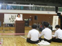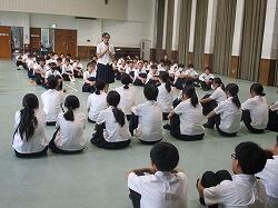 9月19日(木)7時間目に、地区中学校秋季体育大会に向けての壮行式が義友会館で行われました。2年生・1年生中心となった新チームでの初の中体連主催の大会となります。式では激励の言葉を清泉会会長の3年・平山笑里さんが述べました。次いで女子バドミントン部、女子バスケットボール部、男子バスケットボール部の順に、前に整列した選手が全員起立し、各キャプテン(安藤結貴さん・内田陽菜さん・大渡健慈さん)が決意の言葉を述べました(陸上競技に出場する齋藤誠志朗さんは教室で述べました)。そして、男子バスケットボールキャプテンの2年生・大渡健慈さんが堂々と決意を宣誓しました。教頭先生からは「ミスや失敗を恐れず挑戦してほしい」というお話がありました。さあ、いよいよ大会です。本校では23日(月)に開始される男女バスケットボール部が最初に大会に挑んでいくことになります。