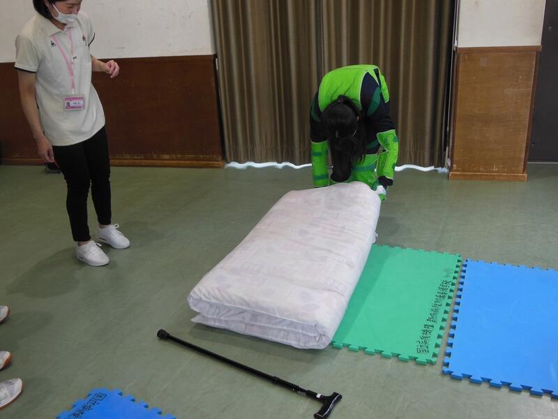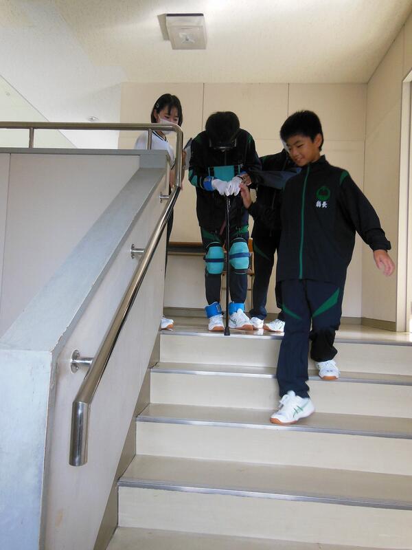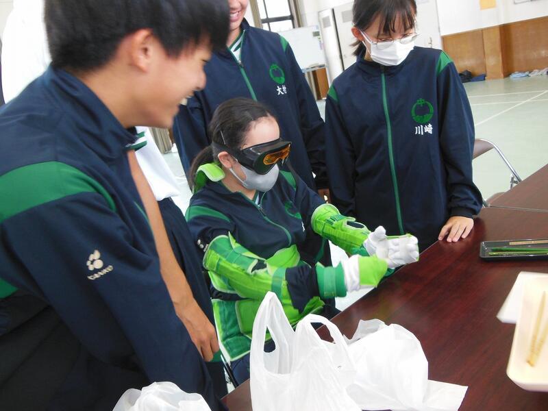 10月8日(火)4・5校時に、1年生は福祉教育体験活動の一環として、「高齢者擬似体験講座」に臨みました。講師としておいでくださったのは、都城医療センター附属看護学校の3名の先生方です。体育着・ジャージに着替えた1年生は義友会館に集合整列。講座は、「高齢者とはどんな特徴があるのだろう」「高齢者はどんな生活をしているのだろう」ということをイメージするところから始まりました。そして、四つのグループに分かれて、それぞれ体に重りをつけ、手袋をつけ、ゴーグルをかけ、高齢者の擬似体験を順に行っていきます。その状態で、階段を上り下りしたり、布団を上げ下ろししたり、ペットボトルなどをあけたり、新聞を読んだり、箸でものを掴んだりするのですが、あちらこちらから「うまく歩けない」「動きにくい」「よく見えない」などの声が上がります。また、擬似体験をしている本人だけではなく、周りのサポートもとても大切になってきます。実際に体験したり、サポートしたりすることを通して、相手に対する配慮や思いやりの気持ちも学べたのではないでしょうか。