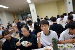 秋晴れのすがすがしい、3連休の始まりとなりました。テストも終了し、生徒達は大喜びでこの「いずみ合宿」に参加できたようです。学級役員、学級活動係さまの手厚いサポートのおかげで無事終了しました。17時半から始まった開校式では、保護者の濱口さん司会のもと、萬壽さんに挨拶をいただき、カレーとサラダの夕食でした。甘口カレーで生徒達には大好評だったようで、4杯もおかわりする生徒もいました。2Aの田中史恩さん、前村柚奈さんをリーダーとして、生徒主体によるレクレーションや勉強会の運営もあり、大いに盛り上がりました。なかなか夜寝れなかった?寝なかった?ようですが、楽しい1泊2日になり、先輩後輩の絆も深まりました。