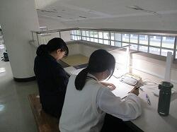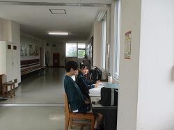 10月23日(木)午後。この日も午前中で授業・テストは終了し、生徒たちは部活動へと明るい表情で向かいました。1・2年生は前日の22日(水)にテストが終了しているため、この日は部活再開二日目です。3年生は科目数が多いので、この日までテストがありました。さて、テスト明けの午後。部活動を回ってみると、はつらつと練習していました。この日うまく出会えた練習中の部活動生は、バドミントン部、男子バスケットボール部、男女テニス部、吹奏楽部。県中体連秋季大会を控える男女テニス部は、特に力の入った練習を繰り広げていました。また、部活動ではありませんが、科学の甲子園ジュニアに向けて、代表チームが先輩たちと一緒に勉強中。さらに、自習コーナーでは、部活の練習待ちの女子バスケットボール部の生徒や、自主的に勉強をしている生徒もいました。朝は雨模様で、学校には落ち葉がたくさん散り敷いていました。午後になってやっと雨も上がりましたが、見上げるも曇天……。晩夏から一気に初冬になった、そんな午後、生徒たちはそれぞれの場で頑張っていました。