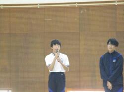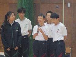 10月29日(水)6~7時間目に、体育館にて清泉会集会と三学年交流会が行われました。最初に清泉会集会が行われ、今年度前半の清泉会執行部(11期)の退任挨拶。全員が一言ずつ挨拶をしました。11期執行部の挨拶の最後は会長だった3年生・田中史恩さんが締めくくりました。そして今年度後半の清泉会執行部(12期)の就任挨拶があり、メンバー紹介の後、12期清泉会会長の2年生・鎌田陽翔さんが代表して挨拶を行いました。11期の清泉会執行部の皆さんは、今年度の基礎固めをしっかりと行ってくれました。ありがとうございました。そして12期の清泉会執行部の皆さんは、これからさらに泉ヶ丘がよりよいものになっていくよう中心となってくれることと思います。どうぞよろしくお願いします。