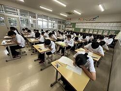 令和7年10月20日(月)の⑦限目に、異学年学習交流を行いました。学習清泉会が中心となって、全体に声掛けし、異学年交流学習が実現しています。教科ごとに分かれて、明日からの定期テストに向けて生徒たちは学習を進めていました。不得意教科の確認学習だったり、やらなけれならない学習の追い込みなど、それぞれが目標をもって取り組めていたようです。また、数学オリンピックに申し込んだ生徒は、数学オリンピックの過去問に挑戦しており、自走学習に向けての弾みにもなったと思います。先輩後輩への質問なども積極的に行っており、ほほえましい場面も見られましたよ。附中生、明日からのテストに全集中!!