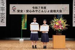 10月18日(土)午後、交通安全や地域安全の意識を高め広める目的で、都城市ウエルネス交流プラザ・ムジカホールにて「安全・安心みやこんじょ盆地大会」が開かれました。その場で、令和7年度交通・地域安全作文・交通安全の部の最優秀賞を受賞した1年生・田口絢音さん、地域安全の部で優秀賞を受賞した1年生・椎屋好乃美さんが表彰されました。おめでとうございます。田口さんはヘルメットの大切さを、椎屋さんは地域見守り隊の活動の大切さを伝えた作文です。最優秀賞の田口さんは会場で作文朗読を披露しました。大変落ち着いた堂々とした素晴らしい発表でした。