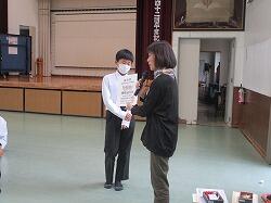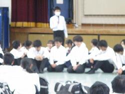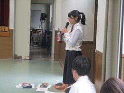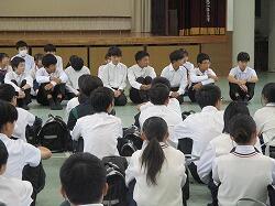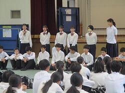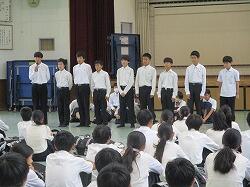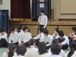 壮行式終了後に、都城地区秋季体育大会・陸上競技年2年1500Mで3位に入賞した2年生・斎藤誠志朗さん、都北地区中学校英語暗唱・弁論大会及び宮崎県中学校英語暗唱大会で素晴らしい弁論や暗唱を発表した3年生・大渡健慈さんと前迫奏亜さんの表彰の紹介がありました。全員で拍手してたたえました。