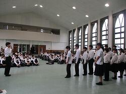 10月22日(水)、第2回定期テスト二日目のテスト終了後、附属中生全員が義友会館に集合し、宮崎県中学校秋季体育大会に向けての壮行式が行われました。県大会に出場するのは、男子テニス部・女子テニス部の二つの部活動、柔道競技・陸上競技の二つの競技です。壮行式では、1年生・水迫和香奈さんが進行を務めました。最初に生徒を代表して3年生・田中史恩さんが中国の逸話を例に、激励の言葉を述べました。続いて、前に並んだ出場選手の代表がそれぞれ決意の言葉を述べました。選手宣誓は男子テニス部主将の2年生・北村隼人さんが、堂々と宣誓しました。県秋季大会は以下の日程で実施されます。全力を尽くして頑張ってください!