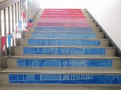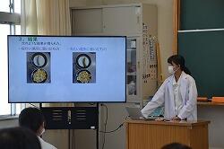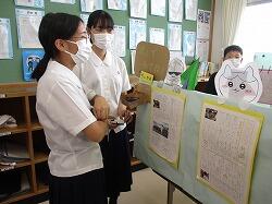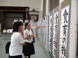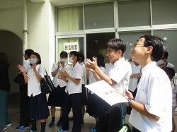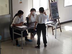 2日目は、校内の各所で、学年・学級単位、文化系を中心とした部活動、生徒会の委員会活動等の展示・発表が行われました。まず最初に校内の部の開会式が放送で行われ、1年生・待木玲香さん、2年生・日野あかりさん、3年生・坂元希成さん、岡元英理奈さんが、それぞれの展示発表の紹介をしました。開会式が済むと、すぐ展示発表の活動に移りました。1年生は「自然科学探究発表」を1A教室と中学校図書室で実施。2年生は「職場体験学習発表」を2A教室で実施。3年生は「修学旅行発表」をセミナーⅡA教室で実施。1年生は個人発表の形式で、発表者は白衣を着て、1学期からテーマを決め、夏休みに主に実験などをして仕上げた自然科学分野の研究発表を一人3分で発表しました。入学後に取り組み始めたばかりの自然科学探究ですが、夏休みを中心に生徒たちが真摯に取り組んできたことがよく伝わってきました。2年生は2Aの教室に、今年度久しぶりに行われた職場体験学習(原則一職場ひとり)について作った新聞が掲示されていました。さらに、グループ毎に職場体験学習の内容を個人が一人2分で発表し、質疑応答を受ける活動も実施。発表も展示も同時に取り組む幅の広さが感じられました。3年生は展示の形式で行いました。昨年度まで感染症で延期・中止・変更された修学旅行だったため、「行く予定の東京」という架空の旅行の紹介となっていましたが、今年度からは久しぶりに「実際に体験してきた東京」を紹介できるので、体験に基づいた充実した内容となりました。シンデレラ城や雷門の模型、動画、出店で売られている物の模型、ミュージカルのポスター、点描アートなど、多岐にわたる創作物が所狭しと展示・紹介され、修学旅行での満足度が肌で感じられました。午前中、9時頃から書道部による書道パフォーマンスが中庭で行われました。中学生の書道部も参加しました。1年生・井上結月さん、瓦田佳子さん、2年生・石橋彩花さんの3名が、高校生に混じって袴姿で大きな用紙に素敵な文字を描き、すばらしい書道アートができあがりました。10時過ぎには体育館で図書委員会主催のビブリオバトルが行われ、1年生の待木玲香さんが出場しました。積極的な話術で本を紹介し、みんなの関心をぐっと引きつけ、優勝を勝ち取りました。おめでとうございます。また、12時過ぎから2年生・瀬口佳蓮さん、日野あかりさんがIzumi Artist stage(学校の部)で、二人で合わせて3曲の歌を披露しました。きれいな歌声で堂々と歌い上げました。学校全体を見て回ると、高校1年生作の階段アートは、クラス毎に個性が光り、学校全体が明るく感じられて楽しい雰囲気を醸し出してくれました。高校2年生は学級毎に教室をイベント会場として、動画あり、ビックリハウスありと、工夫を凝らした展示を行っていて、中学生も楽しんでいました。各部活動も、合同展示やイベントを行っていて、義友会館には中学生の美術部・書道部の作品が展示されていました。美術部の合同作品は、平和への願いが込められた美しい作品でした。いろんな場所に楽しみが詰まった2日目。昼のキッチンカー前で暑い中並んだことも、校内の各所で食べたお昼も、よい思い出になったのではないでしょうか。最後の高校の教頭先生の講評にもあったように、すばらしい文化の部2日間でした。その陰には、高校の先輩方の力がいたるところにあったということを、胸に刻みましょう。附属中から高校理数科に進学した先輩たちも、いろいろな場所で大活躍していたことも嬉しいことでした。そして、将来、皆さんも先輩方のように泉ヶ丘をもり立てていけるよう、積極的に何でも取り組んでほしいと思います。