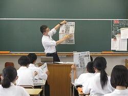 授業では新聞の仕組みや取材の方法、写真の撮り方、記事の書き方、レイアウトの基本といった内容を、実際の新聞を見ながら教えていただきました。新聞のアタマ・カタ・ハラといった名称や、記事の内容の順番、見出しの付け方など、初めて知る内容が満載でした。新聞をめくってじっくり読む姿もあり、よい勉強になりました。最後に生徒を代表して安藤結貴さんがお礼の言葉を述べました。昨今、Web上の新聞を利用する人が増え、紙の新聞を手にする機会が減ってきています。しかし、こうして実際の新聞を手にし、その仕組みや工夫などを学ぶと、紙の新聞のよさもよく伝わってきます。生徒たちが作るのも紙の新聞です。今回学んだことを生かし、わかりやすい新聞を作っていきましょう。