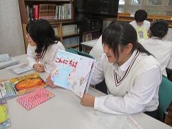 10月17日(木)6時間目、3年生の国語の時間に「絵本の読み聞かせ」について学び、練習しました。来週、「福祉交流体験学習」で保育園・こども園を訪問し学習させていただく予定の3年生。ちょうど技術・家庭科では手作り絵本をそれぞれが制作していて、全員それを持参することになっています。講師を務めてくださったのは司書の相良先生です。授業では、実際に絵本を読み聞かせしていただきながら、読み聞かせの際にどんなことに注意すればよいか、丁寧に分かりやすく説明してくださいました。その後、それぞれのグループで、自分の手作り絵本や図書館にある絵本を使って実際に読み聞かせを練習しました。最後に、全体の前で増田陽さんと平山笑里さんが読み聞かせを披露してくれました。総合的な学習のキャリア探究・福祉として実施する福祉交流体験学習ですが、その学習と、読書・音読・朗読の分野から国語が、保育の分野から家庭科が教科を横断して連携して取り組むことができました。3年生、それぞれなかなか上手に読み聞かせができていました。保育園児に喜んでもらえると嬉しいですね。