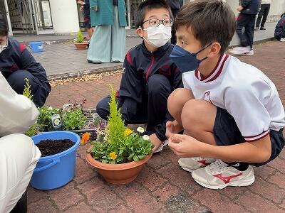 講話の後は、南九州大学の学生と一緒に、花の植栽を行いました。生徒は長江教授からお話しいただいたことを踏まえ、楽しく活動しつつも心を込めて花の植栽を行いました。