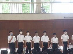 1学期期末テストも、1・2年生は一昨日、3年生は昨日までで終了し、「カーン」と音がしそうな太陽の下、附属中生は日々元気に頑張っています。さて、高校生のテスト終了が本日6月30日(木)で、それを待って、久しぶりに中・高合同の「壮行式」が行われました。中学生は、県大会出場の男女テニス部、吹奏楽部、社会体育から陸上、柔道、新体操、水泳の個人戦に出場する人たちが、全校生徒からエールを受けました。部活動のキャプテンや社会体育の代表者は、それぞれ決意の言葉を述べる場面もあり、堂々と決意の言葉を述べていました。応援団の演舞もあり、温かな応援の気持ちが伝わってきました。また、校長先生からは、全校でこうして応援できることを喜ばれながら、「プライドをもって、泉ヶ丘旋風を巻き起こしてください。」と激励の言葉をいただきました。健康第一に、感染症対策・熱中症対策も怠りなく、代表として大会やコンクールでもてる力を十二分に出してほしいと思います。